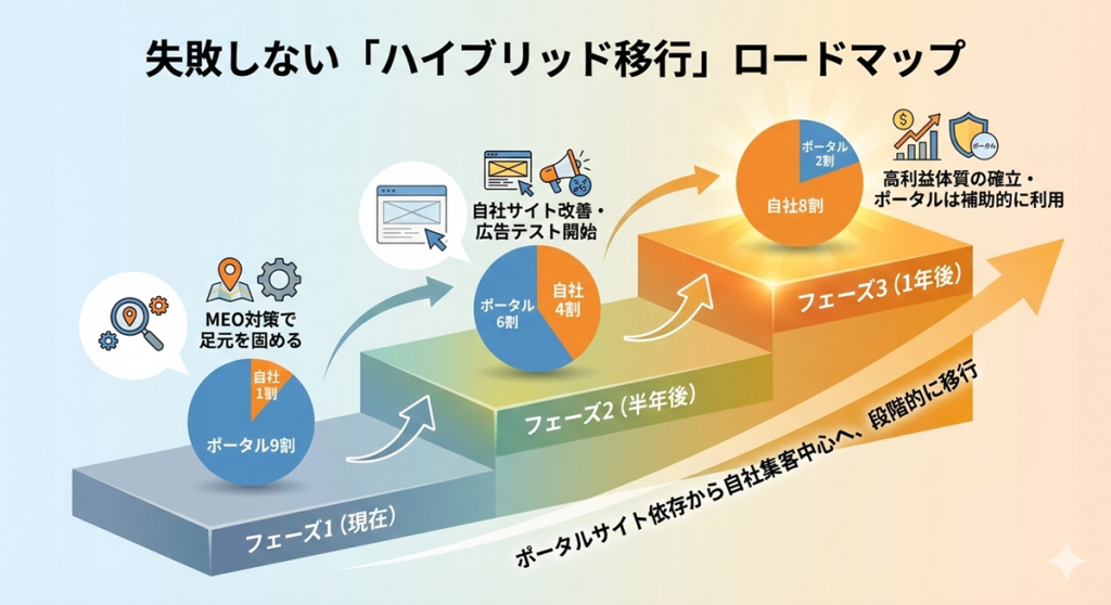その通りです。だからこそ、この記事では「ハイブリッド戦略」を推奨しています。いきなりポータルを解約するのではなく、ポータルを「保険」として残しつつ、以下の3ステップで自社集客の基盤を固めていきましょう。